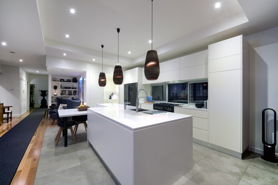 The designer wished to respect the existing streetcape and set the upper storey bedroom to the furthest point possible with regard to the back of the home. High ceilings were utilised in the main bedroom and the ensuite placed within the existing roof line and well within the building envelope. The kitchen area (nucleus of the design) was increased slightly to allow placement of a dining table within the new open plan lower storey design.