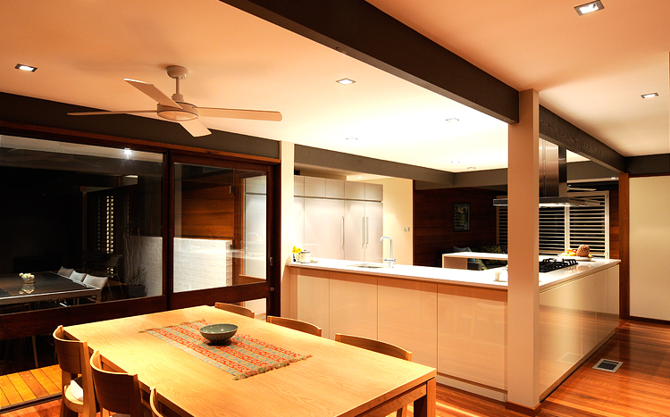 The existing open plan has been retained and modified with a new glass sliding door creating privacy to the new dining room located on the area of the old garden room. The existing kitchen has been extended by removing the original laundry which allows direct access to the new external deck off the new dining room.