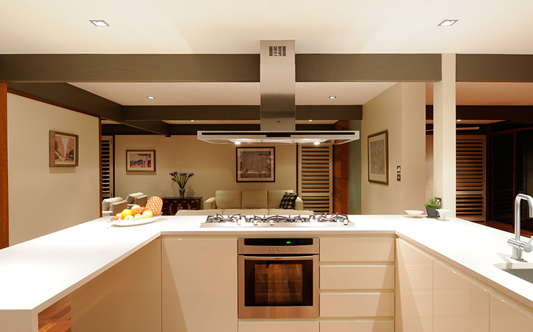 Exposed beams and flat roofs have all been retained with new works being detailed sympathetically to the original character. The Modern look and feel has been retained by refinishing the original cedar boards and timber flooring. Modern Ceasorstone and polyurethane finishes to the kitchen integrate well with its original character. Tile selections and layouts for the bathrooms introduce horizontally, in keeping with the original design, through tile orientation and trim locations.