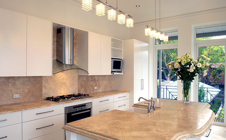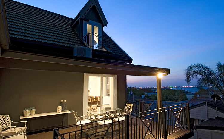 Apart from opening up the interior of the house, one of the two principal ideas was to make the kitchen the centre of the home. It would feature as a place for people to gather, while enjoying Harbour views through new openings in the northern facade, with existing windows enlarged on the eastern side, to allow access to a large new timber balcony. An existing opening to the rear of the new dining room, was widened to form new French doors to the balcony.