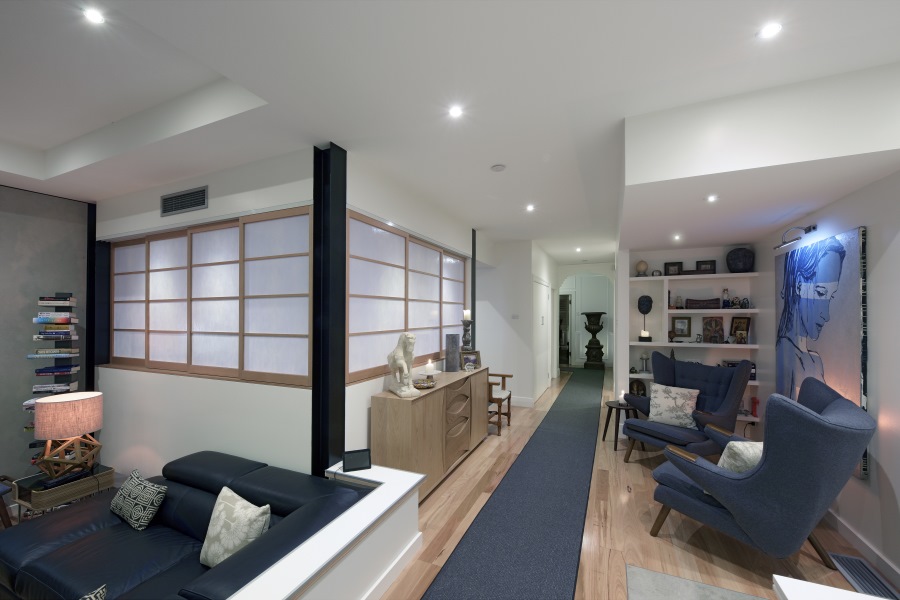 The designer wished to respect the existing streetcape and set the upper storey bedroom to the furthest point possible with regard to the back of the home. High ceilings were utilised in the main bedroom and the ensuite placed within the existing roof line and well within the building envelope. The kitchen area (nucleus of the design) was increased slightly to allow placement of a dining table within the new open plan lower storey design.