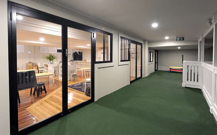 The verandas form both covered access ways to the main outdoor play space, and part of the requirement for undercover play space. The main play space has a new shade structure, as required by government regulation. The whole building has been repainted in off white to lighten the building, and the veranda and undercover spaces.